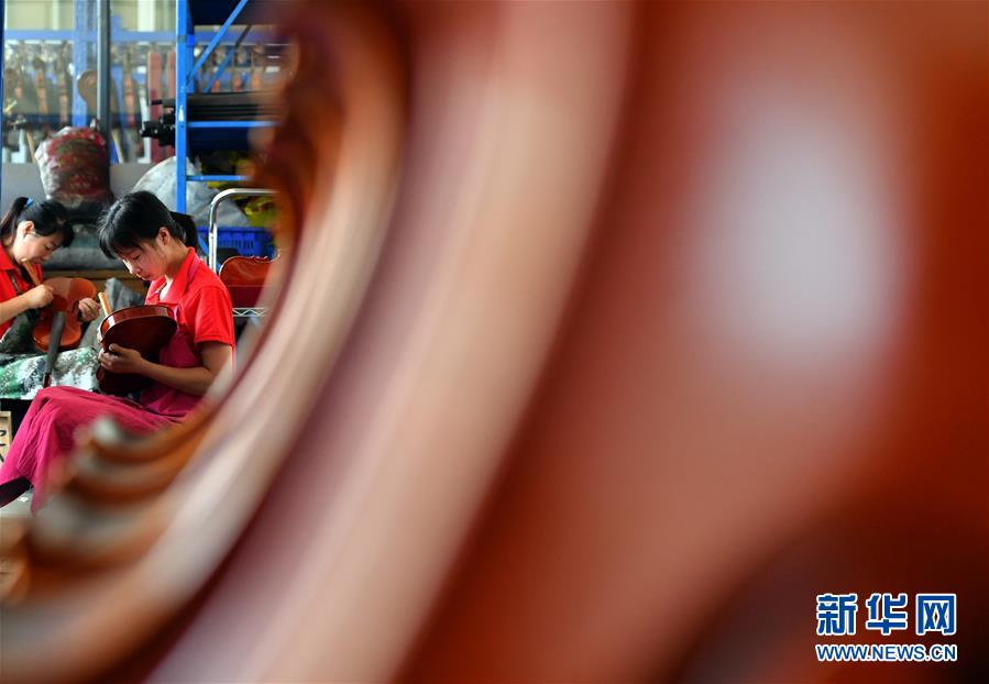 工人在河南驻马店市确山县提琴产业园提琴生产车间工作(7月3日摄)。 新华社记者 李嘉南 摄