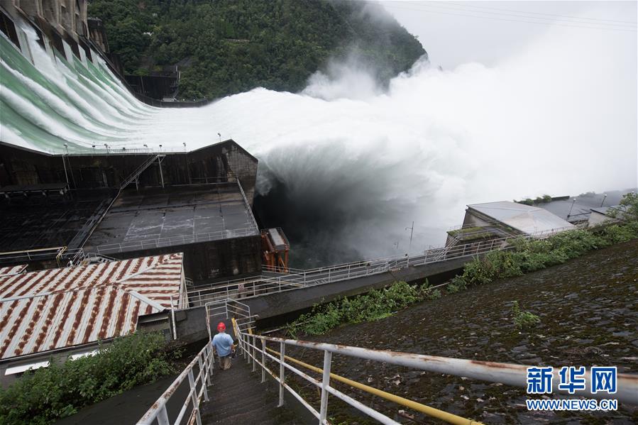 7月8日,新安江水库开启9孔泄洪,新安江电厂工作人员在坝区巡视。 新华社记者 翁忻旸 摄