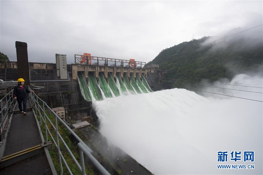 7月8日,新安江水库开启9孔泄洪,工作人员在新安江电厂开关站上进行设备巡查。 新华社记者 翁忻旸 摄