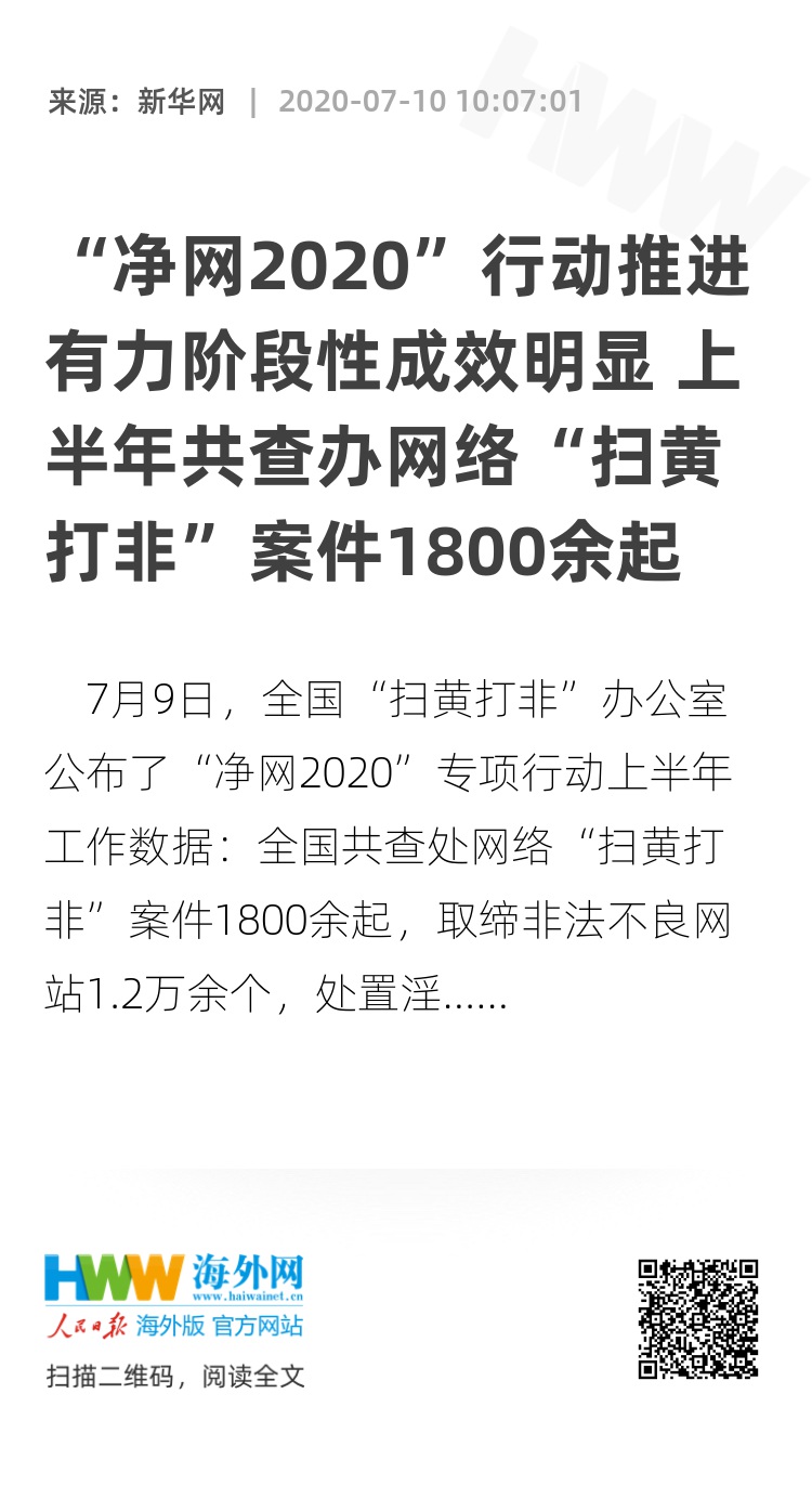 7月9日,全国“扫黄打非”办公室公布了“净网2020”专项行动上半年工作数据:全国共查处网络“扫黄打非”案件1800余起,取缔非法不良网站1.2万余个,处置淫秽色情等有害信息840余万条。