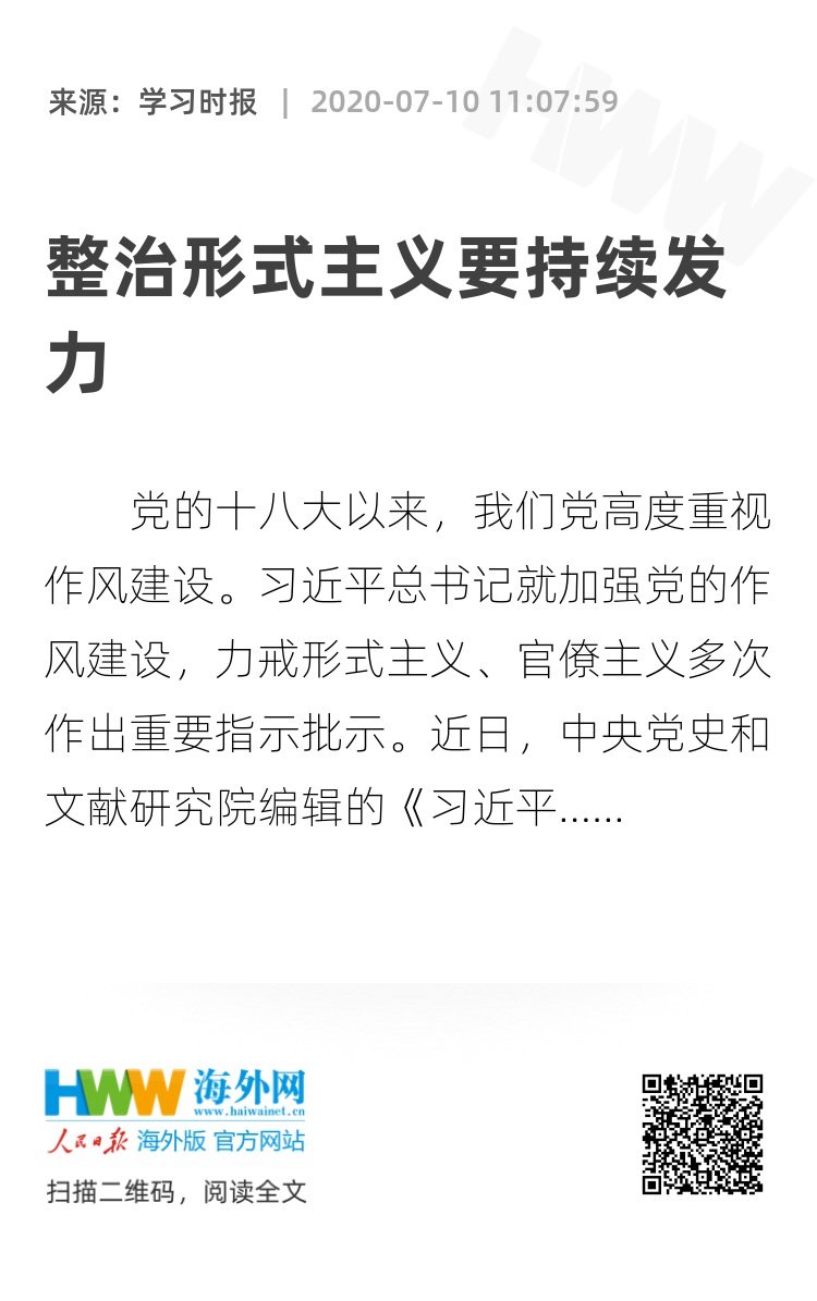 党的十八大以来,我们党高度重视作风建设。习近平总书记就加强党的作风建设,力戒形式主义、官僚主义多次作出重要指示批示。近日,中央党史和文献研究院编辑的《习近平关于力戒形式主义官僚主义重要论述选编》出版,发表了习近平总书记关于整治形式主义、官僚主义的一系列重要论述。2019年3月和2020年4月,中办分别印发《关于解决形式主义突出问题为基层减负的通知》《关于持续解决困扰基层的形式主义问题为决胜全面建成小康社会提供坚强作风保证的通知》的文件,精准施策、靶向发力,整治形式主义,为基层降压减负,充分显示出以习近平同志为核心的党中央以更大决心、更强力度和更实举措持续解决困扰基层的形式主义问题的意志和毅力。