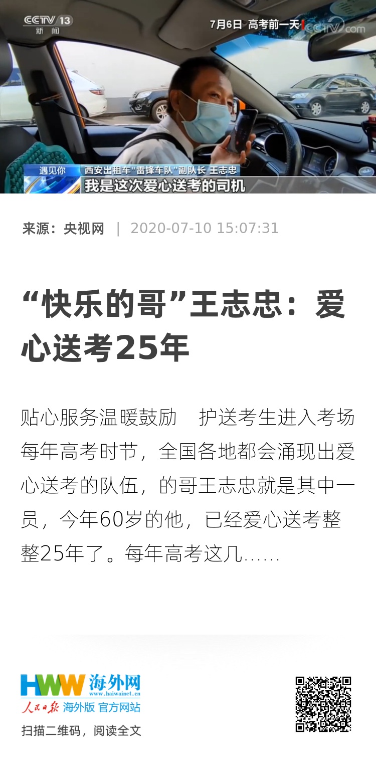 王志忠做为西安出租车“雷锋车队”的副队长,25年间免费接送高考考生上千人,为了确保熟悉路况,每年高考的前一天,他都会把负责接送的考生住所和考点走一遍。他贴心细致的服务,也被学生们口口相传。