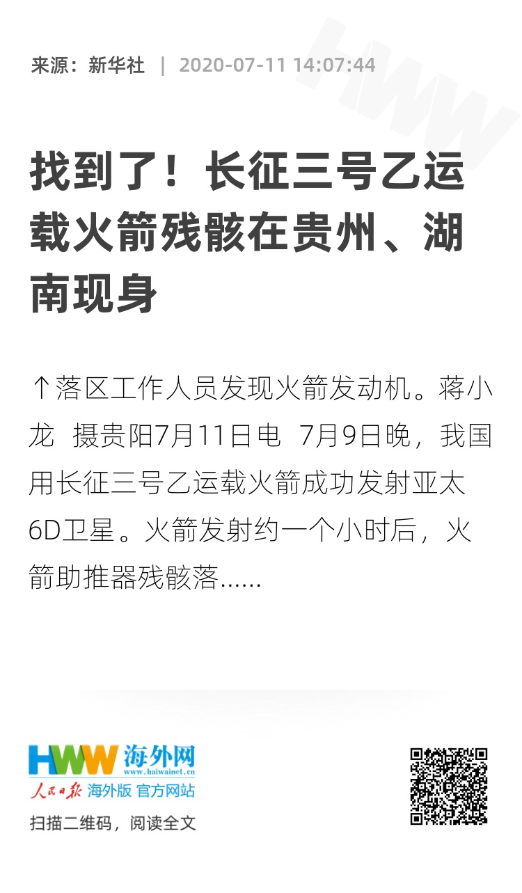 新华社贵阳7月11日电 7月9日晚,我国用长征三号乙运载火箭成功发射亚太6D卫星。火箭发射约一个小时后,火箭助推器残骸落入贵州省余庆县和石阡县境内,火箭一级箭体残骸落入湖南省绥宁县境内。