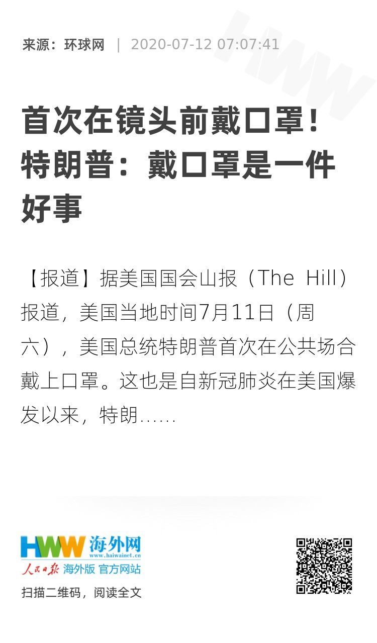 【环球网报道】据美国国会山报(The Hill)报道,美国当地时间7月11日(周六),美国总统特朗普首次在公共场合戴上口罩。这也是自新冠肺炎在美国爆发以来,特朗普首次在镜头前戴上口罩。