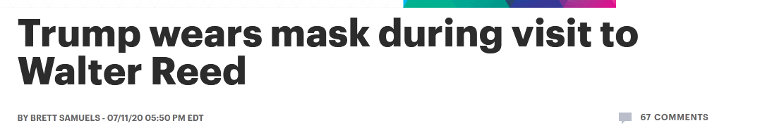 报道称,特朗普当访问了位于华盛顿郊外的沃尔特·里德军事医院,探望了受伤的退伍士兵和照顾新冠肺炎患者的医护人员。根据电视新闻镜头显示,特朗普在与受伤士兵会面时面戴黑色口罩。