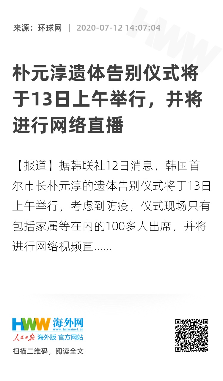 【环球网报道】据韩联社12日消息,韩国首尔市长朴元淳的遗体告别仪式将于13日上午举行,考虑到防疫,仪式现场只有包括家属等在内的100多人出席,并将进行网络视频直播。