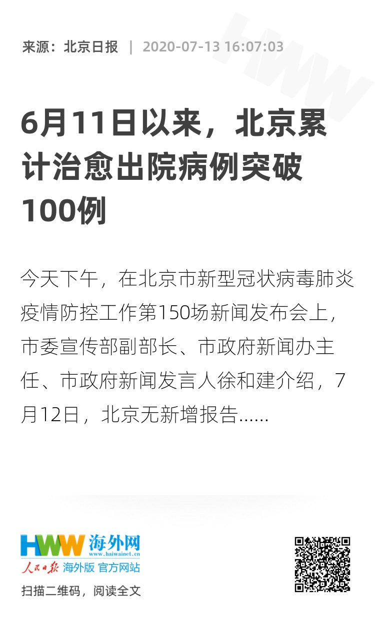 今天下午,在北京市新型冠状病毒肺炎疫情防控工作第150场新闻发布会上,市委宣传部副部长、市政府新闻办主任、市政府新闻发言人徐和建介绍,7月12日,北京无新增报告本地确诊病例、疑似病例和无症状感染者,治愈出院病例14例。