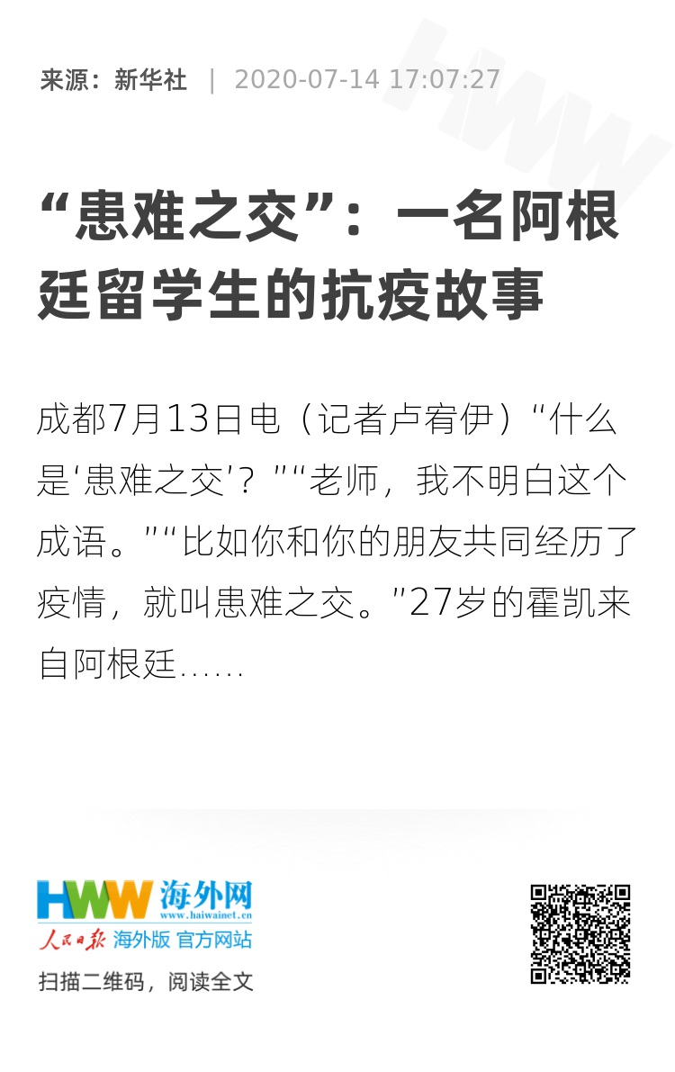 那天,霍凯作为志愿者和红十字会的工作人员一起工作到凌晨,将祖国寄来的医疗物资进行分类、打包。“这对我来说是非常难忘的经历,在中国朋友危难的时候,阿根廷伸出了援手,我为我的祖国感到自豪。”