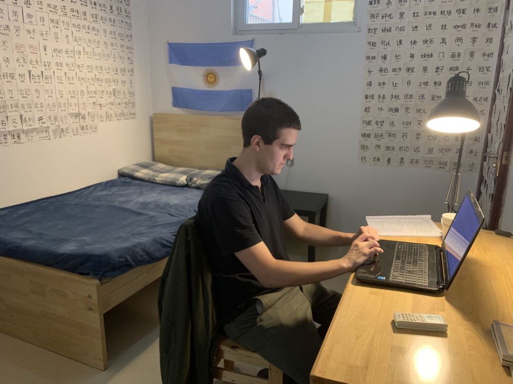 27岁的霍凯来自阿根廷,目前是西南交通大学工商管理专业的一名研究生。这会儿,霍凯正在宿舍里通过在线课程软件聚精会神地上汉语课,自新冠肺炎疫情暴发以来,霍凯所修的大部分课程都通过线上的方式授课。