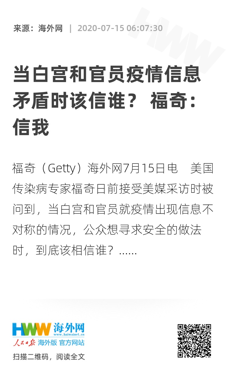 海外网7月15日电 美国传染病专家福奇日前接受美媒采访时被问到,当白宫和官员就疫情出现信息不对称的情况,公众想寻求安全的做法时,到底该相信谁?对此,福奇表示,公众可以信任他。
