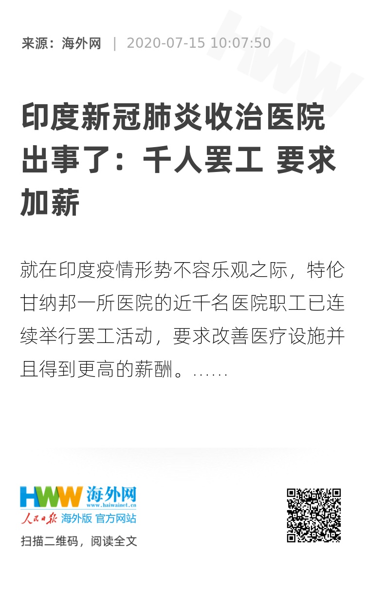 印媒称,这已经不是该医院的卫生工作者们首次出来抗议了。早前,一名新冠肺炎患者去世后,其亲属袭击了医院医生,随即引发抗议。在3天的抗议活动以及政府表示会保证其人身安全后,医院的医生们才恢复工作。(海外网 张霓)