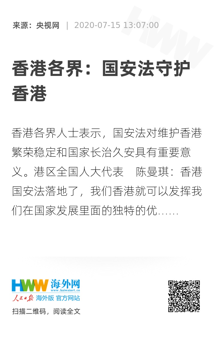 香港各界人士表示,国安法对维护香港繁荣稳定和国家长治久安具有重要意义。