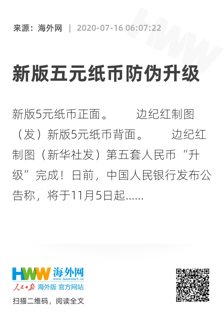 据悉,2020年版第五套人民币5元纸币将保持2005年版第五套人民币5元纸币规格、主图案、主色调、“中国人民银行”行名、国徽、盲文面额标记、汉语拼音行名、民族文字等要素不变。