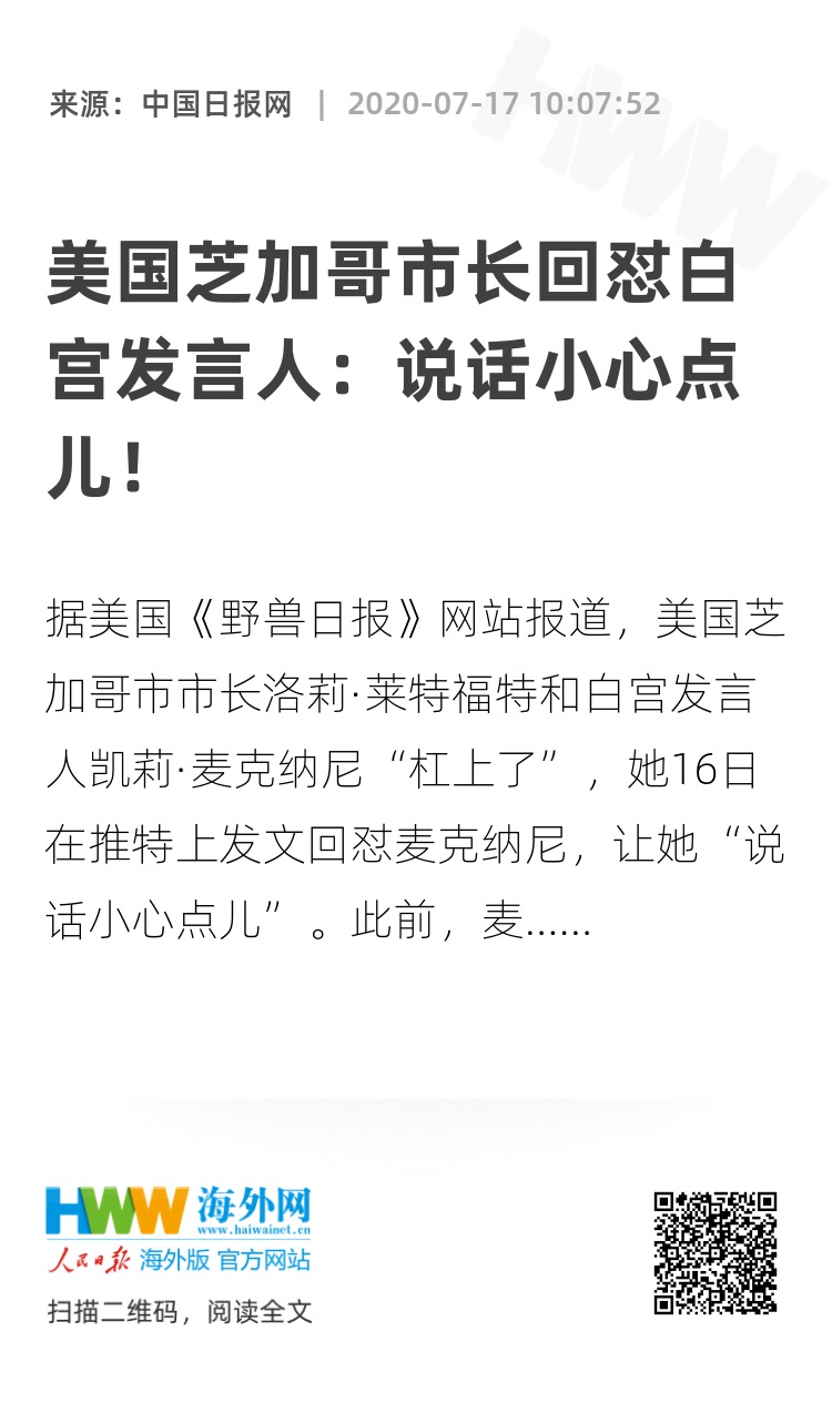 据美国《野兽日报》网站报道,美国芝加哥市市长洛莉·莱特福特和白宫发言人凯莉·麦克纳尼“杠上了”,她16日在推特上发文回怼麦克纳尼,让她“说话小心点儿”。