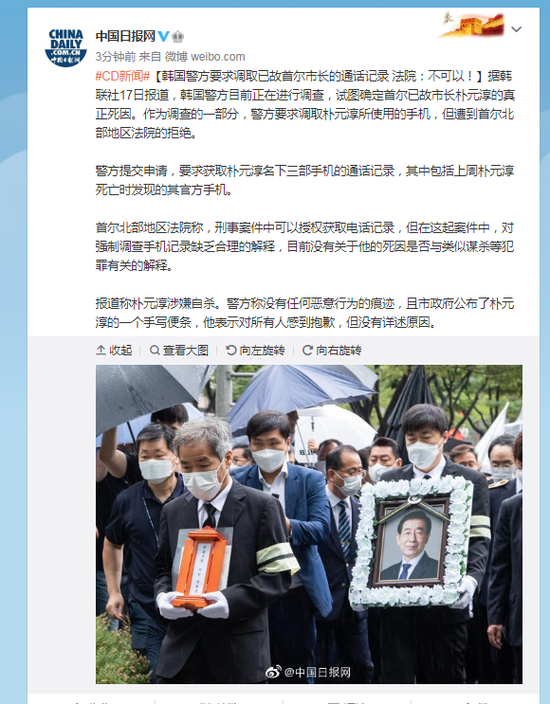 据韩联社17日报道,韩国警方目前正在进行调查,试图确定首尔已故市长朴元淳的真正死因。作为调查的一部分,警方要求调取朴元淳所使用的手机,但遭到首尔北部地区法院的拒绝。