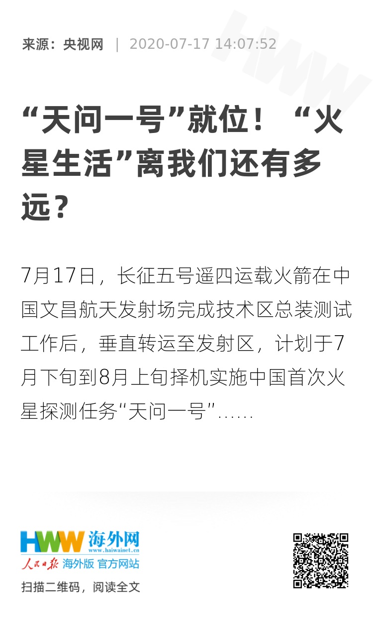 7月17日,长征五号遥四运载火箭在中国文昌航天发射场完成技术区总装测试工作后,垂直转运至发射区,计划于7月下旬到8月上旬择机实施中国首次火星探测任务“天问一号”。