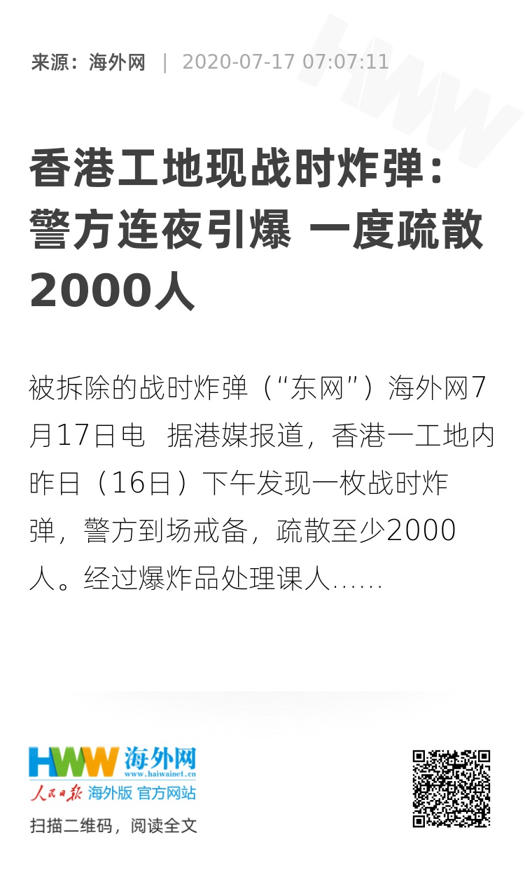 海外网7月17日电 据港媒报道,香港一工地内昨日(16日)下午发现一枚战时炸弹,警方到场戒备,疏散至少2000人。经过爆炸品处理课人员数次引爆,17日早,炸弹被成功拆除,附近地铁服务逐渐恢复。