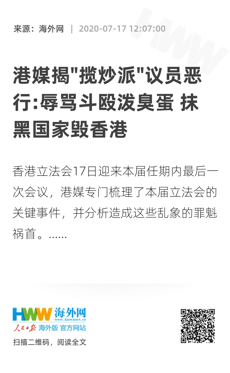 海外网7月17日电 香港立法会17日迎来本届任期内最后一次会议。可即使前两日的最后几次会议,仍不能善终,在“揽炒派”疯狂拉布、不停点算法定人数下连续两日流会,似乎呼应了本届立法会屡禁不止的乱象。为此,港媒17日专门梳理了本届立法会的关键事件,并分析造成这些乱象的罪魁祸首。立法会在一些议员的煽动下被非法冲击、内部出现臭弹、抢手机等失了底线的招数,屡屡令社会大跌眼镜。