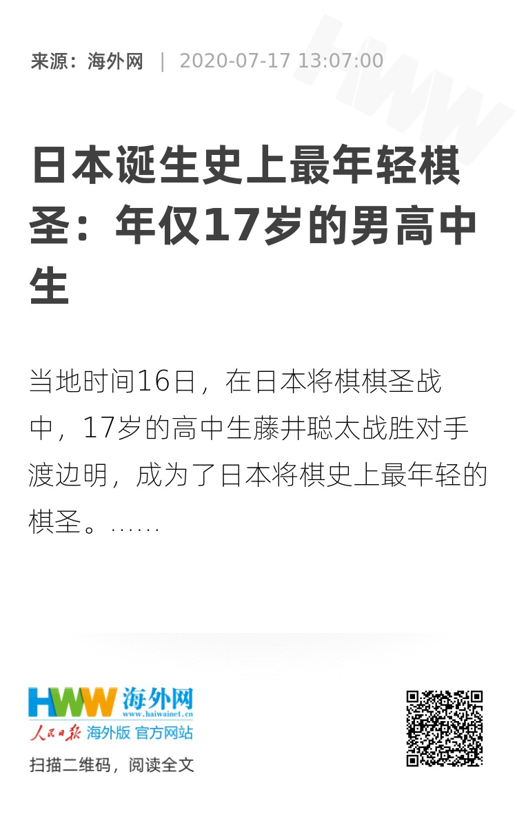 海外网7月17日电 当地时间16日,在日本将棋棋圣战中,17岁的高中生藤井聪太战胜对手渡边明,成为了日本将棋史上最年轻的棋圣。