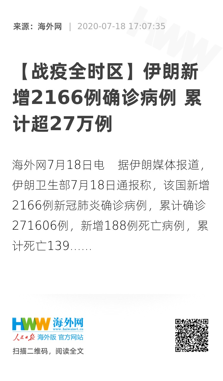 31838188,.【战疫全时区】伊朗新增2166例确诊病例 累计超27万例,.2020-07-18 17:50:35,.204413,.王珊宁、张敏