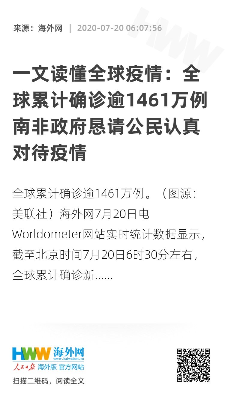 海外网7月20日电 Worldometer网站实时统计数据显示,截至北京时间7月20日6时30分左右,全球累计确诊新冠肺炎病例14613868例,累计死亡病例608300例,75个国家确诊病例超过万例。