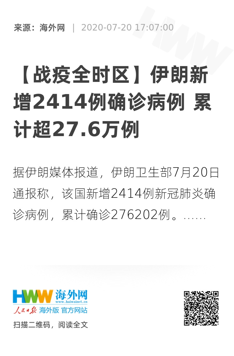 海外网7月20日电 据伊朗媒体报道,伊朗卫生部7月20日通报称,该国新增2414例新冠肺炎确诊病例,累计确诊276202例,新增217例死亡病例,累计死亡14405例。
