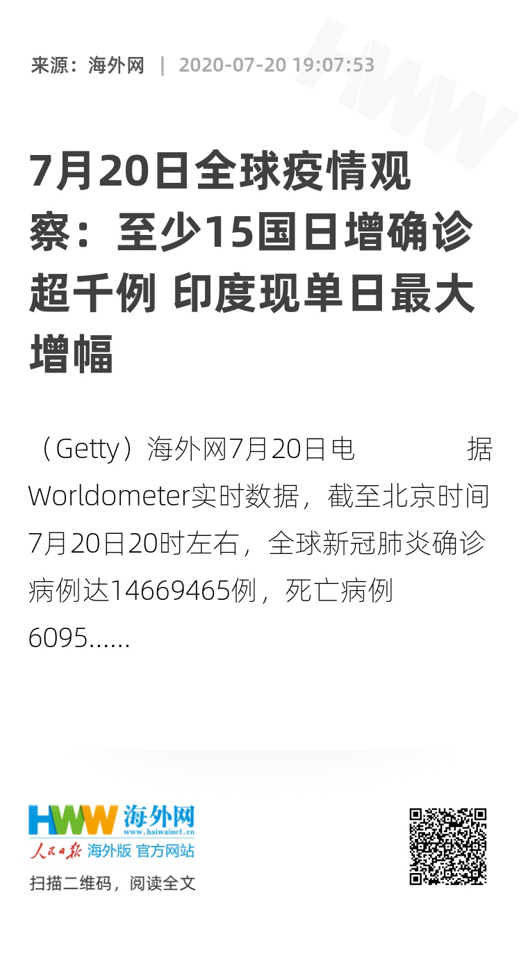 海外网7月20日电 据Worldometer实时数据,截至北京时间7月20日20时左右,全球新冠肺炎确诊病例达14669465例,死亡病例609531例。包括美国、巴西、俄罗斯等国在内的至少15个国家单日新增确诊病例数均超过千例,其中美国新增64489例,巴西新增23529例,印度新增40425例,俄罗斯新增5940例。