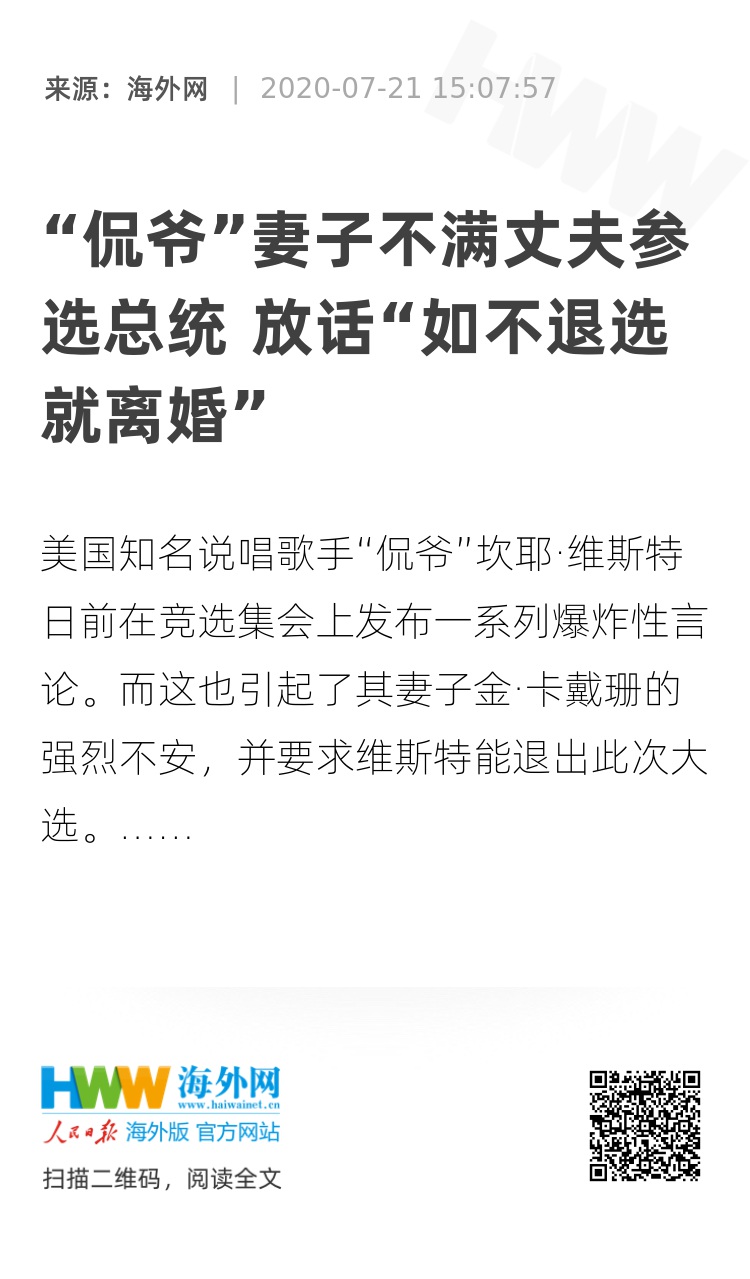 海外网7月21日电 日前,美国知名说唱歌手“侃爷”坎耶·维斯特举行了首场总统竞选集会,并发表一系列爆炸性言论。而这也引起了其妻子金·卡戴珊的强烈不安,并希望维斯特能退出此次大选。