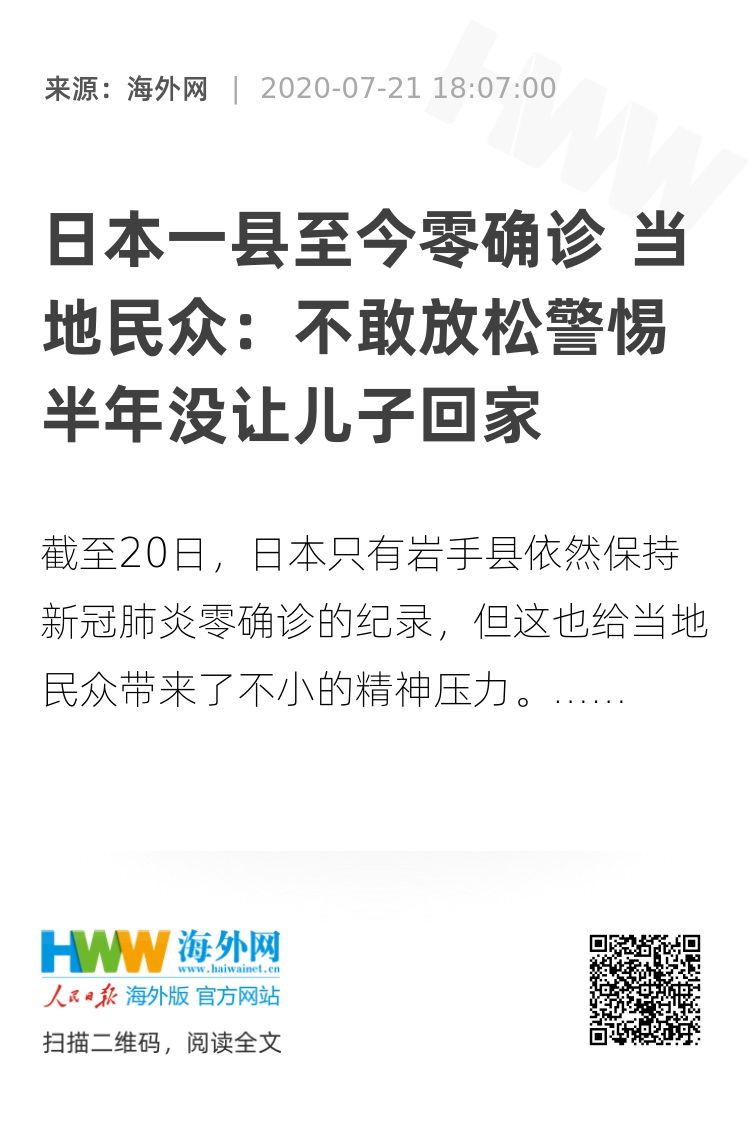 海外网7月21日电 截至20日,日本只有岩手县依然保持新冠肺炎零确诊的纪录,但这也给当地民众带来了不小的精神压力。6月末,一名住在东京工作的男性询问父亲能不能回岩手老家时,得到的回复是“绝对不要回来,我不想上新闻”。