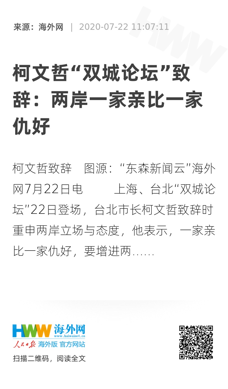 海外网7月22日电 上海、台北“双城论坛”22日登场,台北市长柯文哲致辞时重申两岸立场与态度,他表示,一家亲比一家仇好,要增进两岸善意互动与人民福祉。