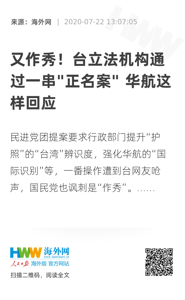 在消息发出后,台“交通部”忙表示将根据“立院”决议处理。华航则表示,不予评论。有台网友讽刺,民进党又在暗戳戳地推“独”了,“又想拿这招骗票吗?”