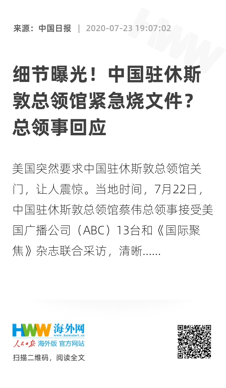 当地时间,7月22日,中国驻休斯敦总领馆蔡伟总领事接受美国广播公司(ABC)13台和《国际聚焦》杂志联合采访,清晰解释了事情的来龙去脉。