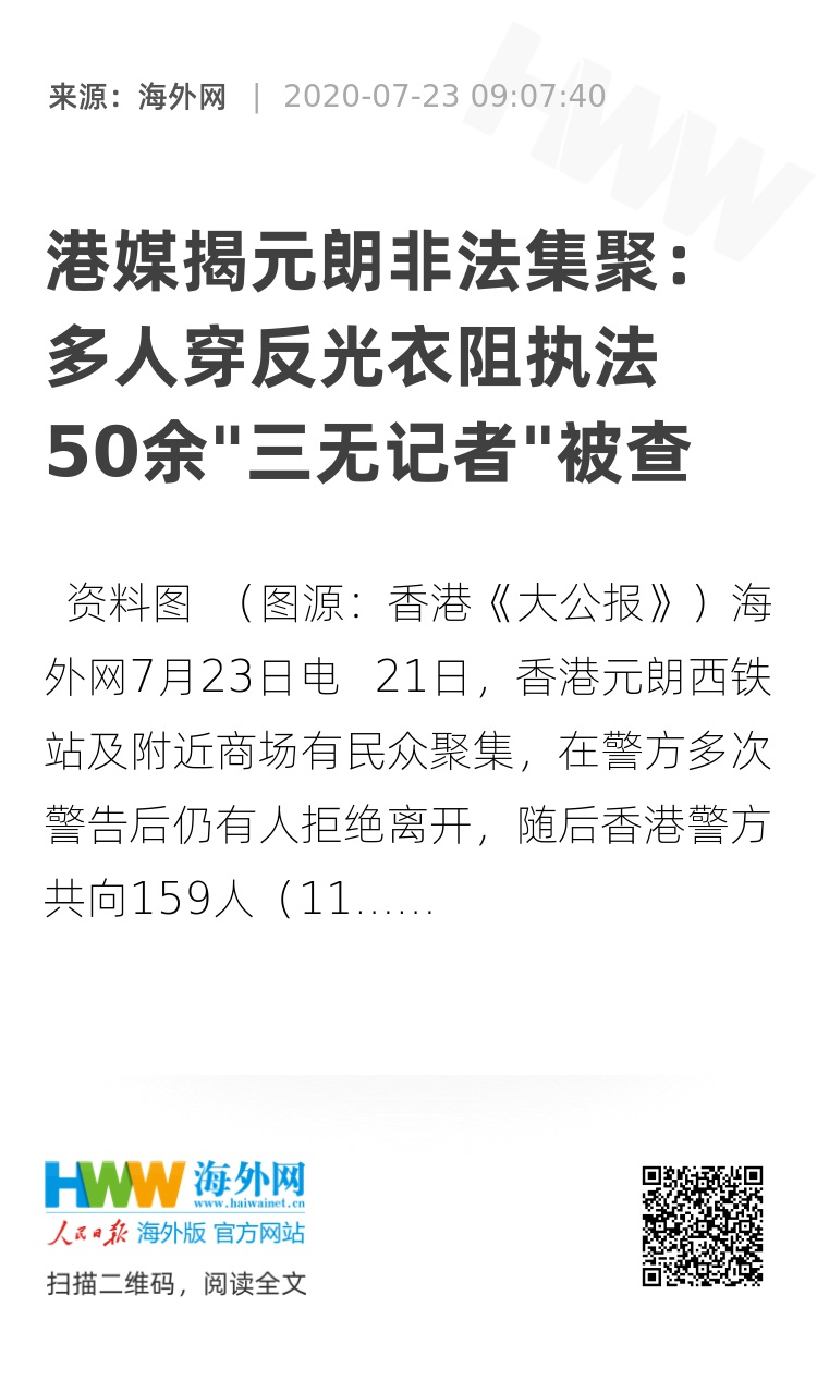 海外网7月23日电 21日,香港元朗西铁站及附近商场有民众聚集,在警方多次警告后仍有人拒绝离开,随后香港警方共向159人(112男47女)发出定额罚款告票,其中约50人是没有在香港特区政府新闻处登记、无受雇机构、无出示有效记者证的“三无记者”。