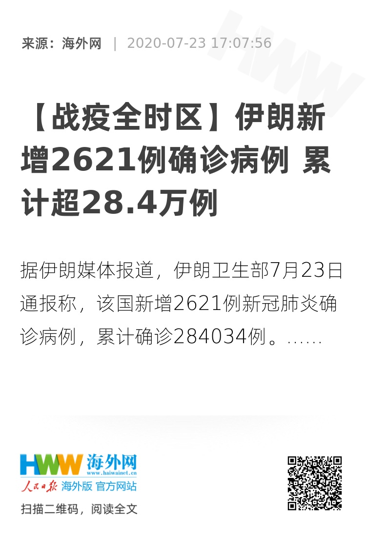 海外网7月23日电 据伊朗媒体报道,伊朗卫生部7月23日通报称,该国新增2621例新冠肺炎确诊病例,累计确诊284034例,新增221例死亡病例,累计死亡15074例。
