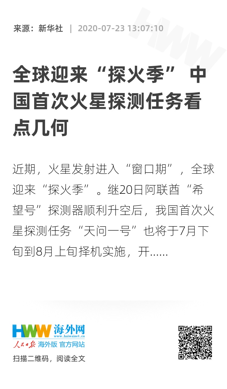 近期,火星发射进入“窗口期”,全球迎来“探火季”。继20日阿联酋“希望号”探测器顺利升空后,我国首次火星探测任务“天问一号”也将于7月下旬到8月上旬择机实施,开启属于中国人自己的行星探测时代。