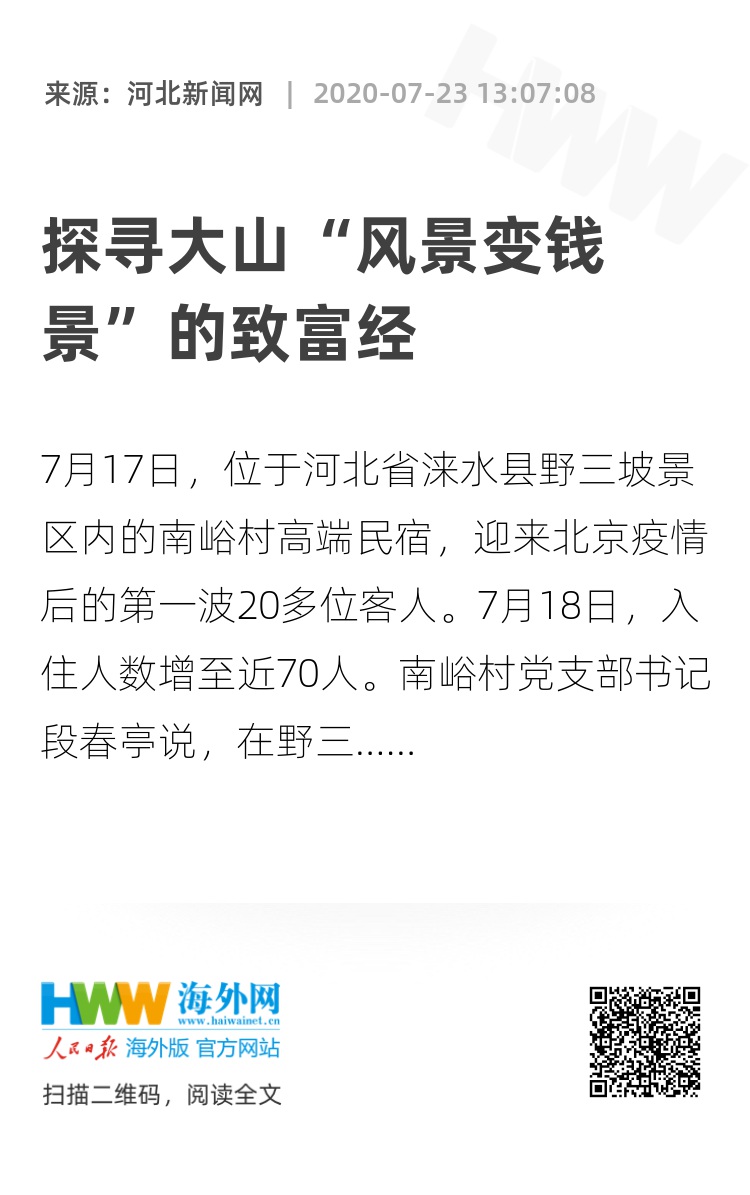 7月17日,位于河北省涞水县野三坡景区内的南峪村高端民宿,迎来北京疫情后的第一波20多位客人。7月18日,入住人数增至近70人。南峪村党支部书记段春亭说,在野三坡大景区的带动下,通过大力发展高端民宿产业,全村691人人均年收入已从1999年的2000多元增至8800元,实现了脱贫致富。