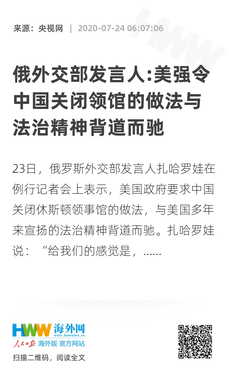 23日,俄罗斯外交部发言人扎哈罗娃在例行记者会上表示,美国政府要求中国关闭休斯顿领事馆的做法,与美国多年来宣扬的法治精神背道而驰。