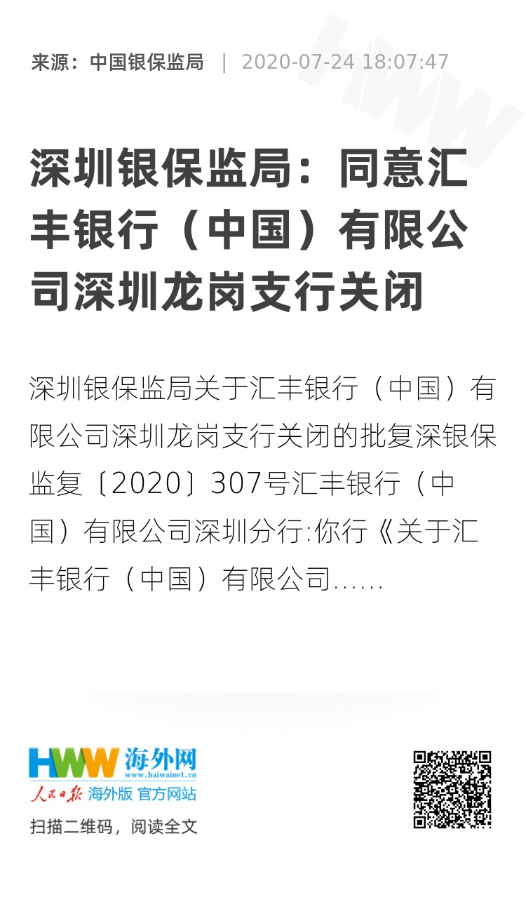 你行《关于汇丰银行(中国)有限公司深圳龙岗支行关闭的申请》收悉。根据《中华人民共和国外资银行管理条例》(国务院令第720号)、《中华人民共和国外资银行管理条例实施细则》(中国银保监会令2019年第6号)以及《中国银保监会外资银行行政许可事项实施办法》(中国银保监会令2019年第10号)的有关规定,经审核,批复如下: