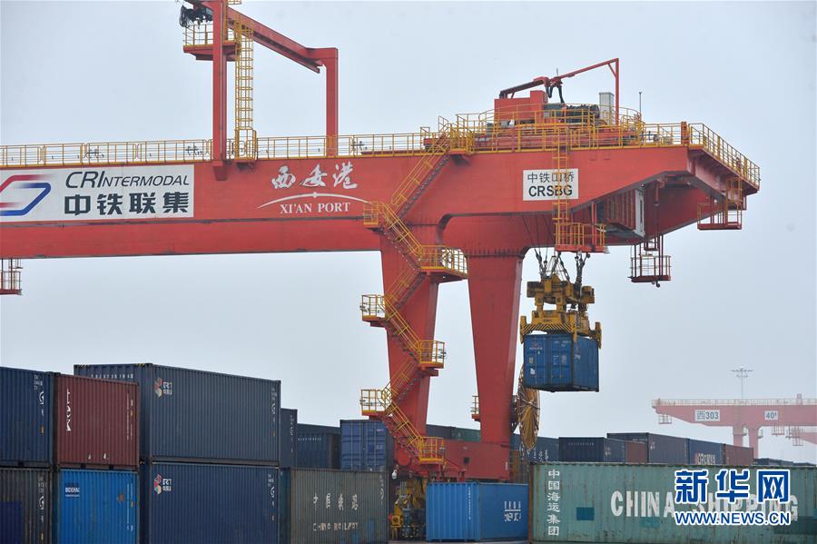 7月24日,作业人员在西安新筑车站货场吊运中欧班列集装箱。新华社发(唐振江 摄)