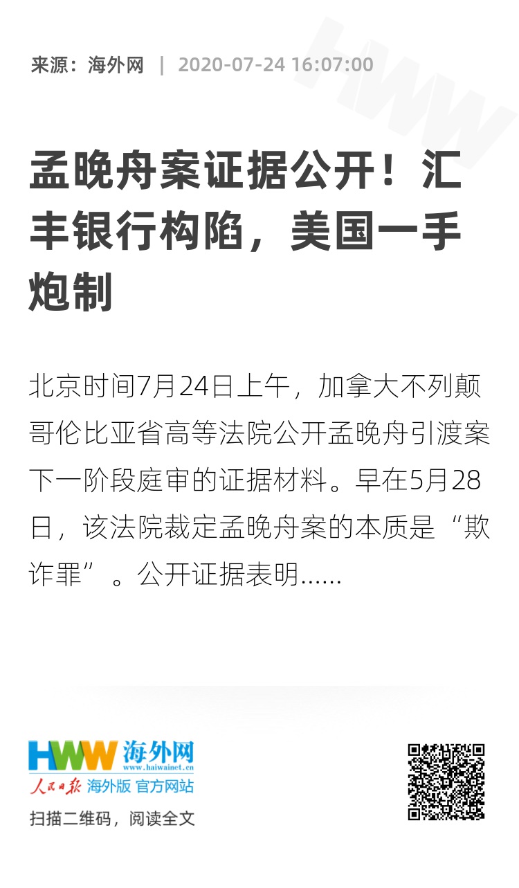北京时间7月24日上午,加拿大不列颠哥伦比亚省高等法院公开孟晚舟引渡案下一阶段庭审的证据材料。早在5月28日,该法院裁定孟晚舟案的本质是“欺诈罪”。