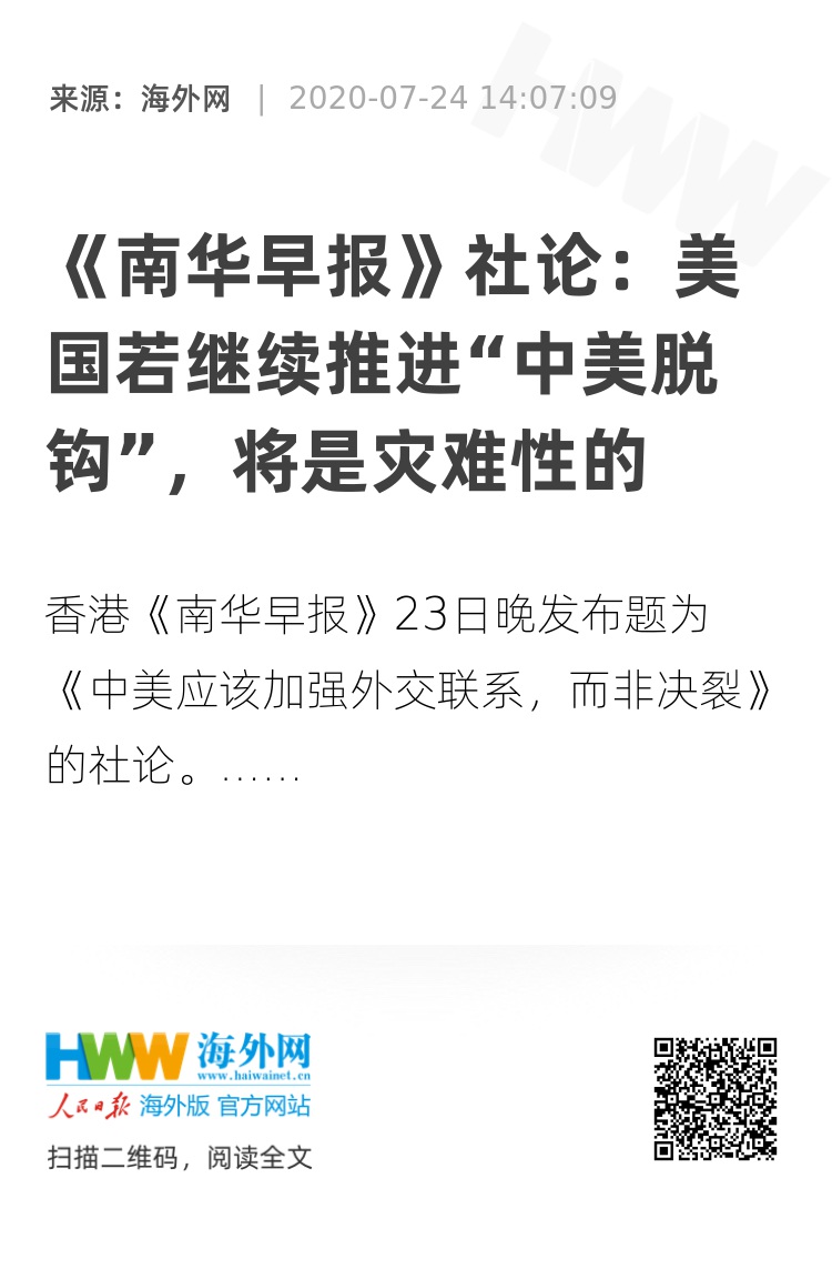 海外网7月24日电 香港《南华早报》23日晚发布题为《中美应该加强外交联系,而非决裂》的社论。文章指出,美国把中国驻美总领馆作为替罪羊,是进一步的挑衅行为。如果美国政府继续推进“脱钩”,让两国陷入另一场冷战,将造成灾难性后果。