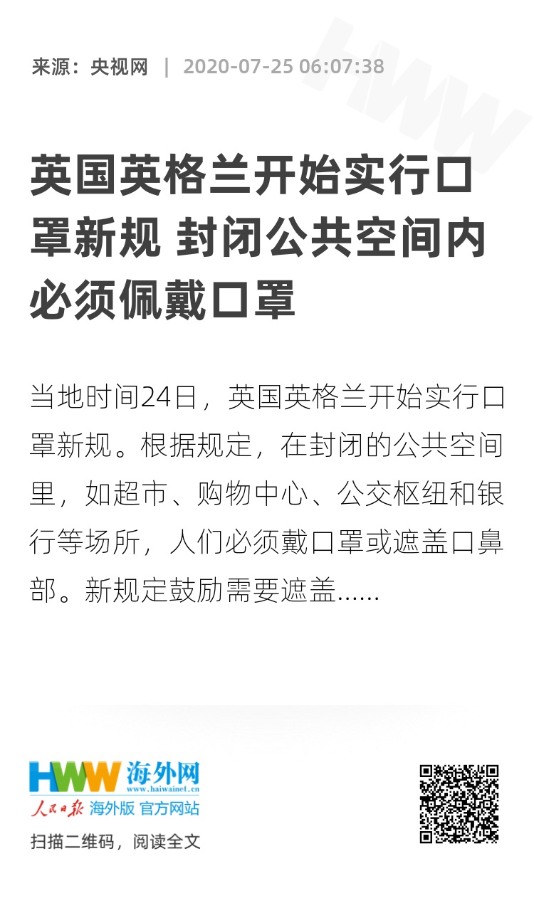 在苏格兰,从7月10日起强制顾客在商店购物时戴口罩,已经有一人因不戴口罩而被罚款。在威尔士和北爱尔兰,目前还未要求购物者戴口罩。(总台记者 康炘冬)
