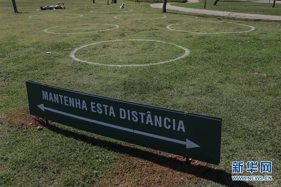 为了民众在疫情期间保持安全社交距离,巴西圣保罗市一些公园的草坪上画上了圆圈,提示民众待在圈内休闲。 新华社发(拉赫尔·帕特拉索摄)