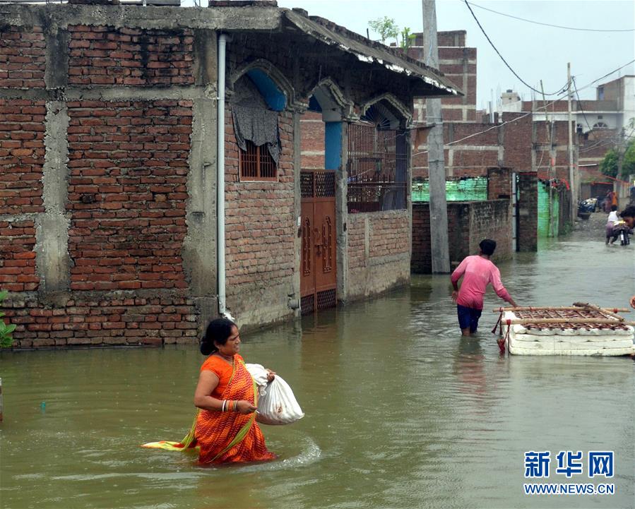 7月26日,人们在印度比哈尔邦穆扎法尔布尔涉水行走。 印度东北部比哈尔邦灾害管理部门26日发表公报说,该邦近日遭洪灾袭击,造成至少10人死亡、近150万人受灾。 新华社发