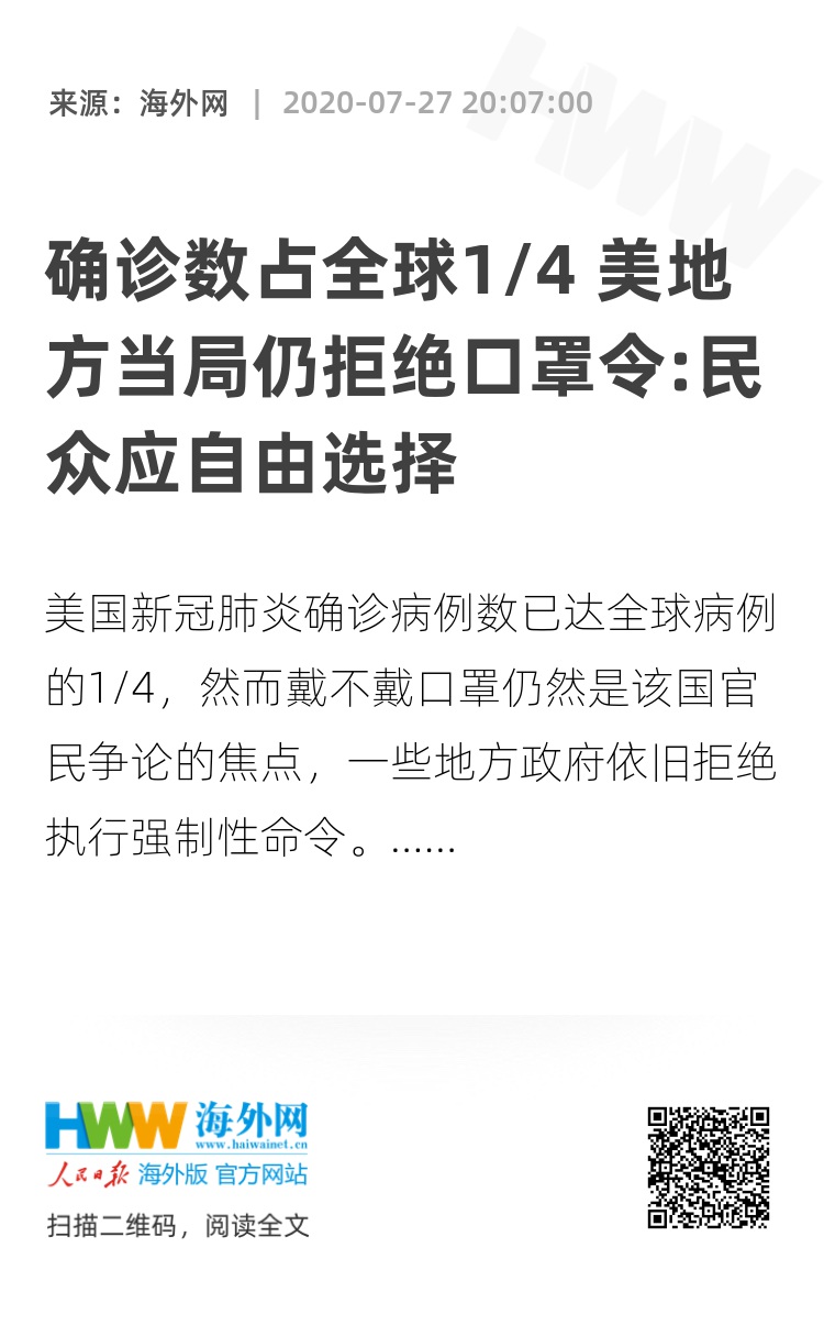 海外网7月27日电 美国新冠肺炎确诊病例数已达全球病例的1/4。官员们正努力减缓该病毒的猖獗蔓延,但戴不戴口罩仍然是该国争论的焦点,一些地方政府依旧拒绝执行强制性命令。