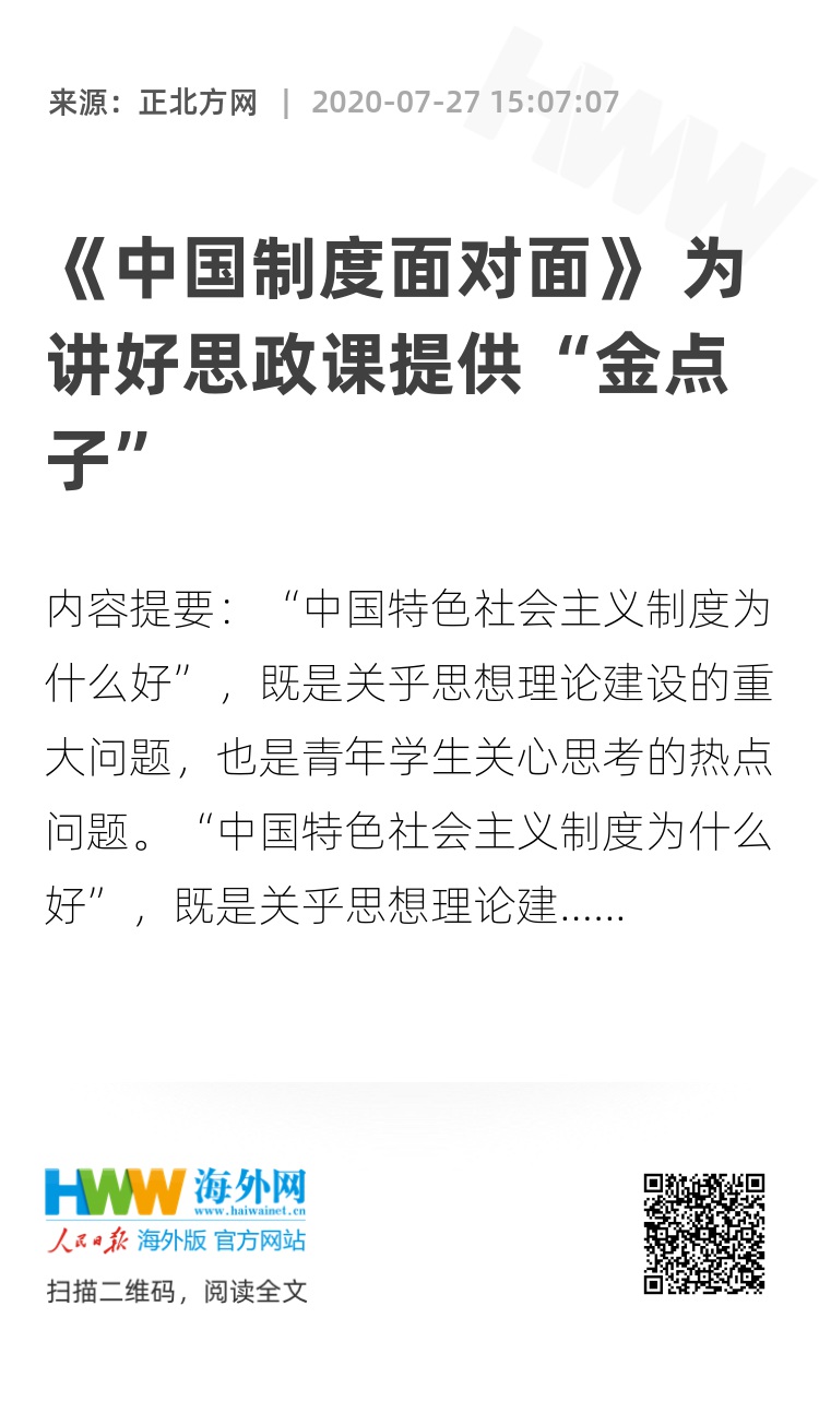 传播形式创“新”,理论才能更走“心”。《中国制度面对面》用16句诗引出16个问题,文风活泼,语言通俗、情感充沛。“我们生于斯长于斯的中华大地,应该是蓝天常在、青山永秀、绿水长流的美丽中国”“站在历史和未来的交汇点上,人民对中国制度的艰难探索感慨万千,对中国制度的博大精深由衷赞叹,对中国制度的雄浑伟力无比自豪”,这样的话语中满满自信之情溢于言表。同时,通过运用采访和链接等方式,精心编制知识链接、云热评、权威声音、特别关注、直播现场、在线答疑等131个资料栏目,既有大量的生动图说,又有深度阅读的扫码链接,还有配套有声书与动漫微视频,适应了新的网络传播方式和阅读习惯,也为解决圈层之间、代际之间、专业学术和社会大众之间的沟通提供了有效渠道。此外,通过拟人化的制度大家庭群像,角色化演绎、故事化表达、场景化呈现、趣味化展示,生动活泼地展现中国特色社会主义制度的丰富内涵和显著优势,增强了理论宣传的时代感和吸引力。这种事论图文结合、线上线下结合的整体呈现,让中国制度的生命力跃然眼前。这启发我们,讲好思政课,就要着力解决有限的教学手段与无限的学习需求之间的矛盾,既要结合青年大学生的思想实际,从理论阐释、新闻视角、问题意识等多个维度去着力,也要用通俗语言、简洁文风、活泼形式去吸引,推动思政课“课堂革命”,提升思政课亲和力,为实现伟大目标凝聚奋进力量。