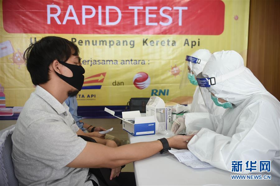 7月27日,一名男子在印度尼西亚雅加达的一个火车站接受新冠病毒检测。 新华社发(祖卡南摄)