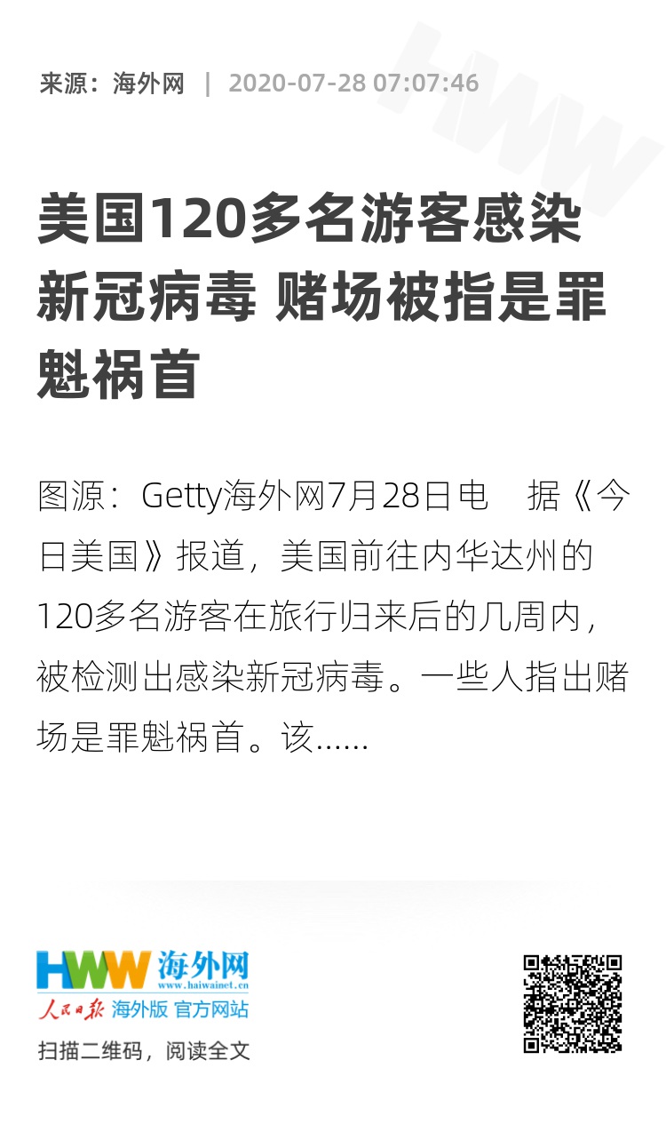 海外网7月28日电 据《今日美国》报道,美国前往内华达州的120多名游客在旅行归来后的几周内,被检测出感染新冠病毒。一些人指出赌场是罪魁祸首。该州的赌场于6月4日重新开放,州长史蒂夫·西索拉克希望通过游客回归来振兴拉斯维加斯的经济。