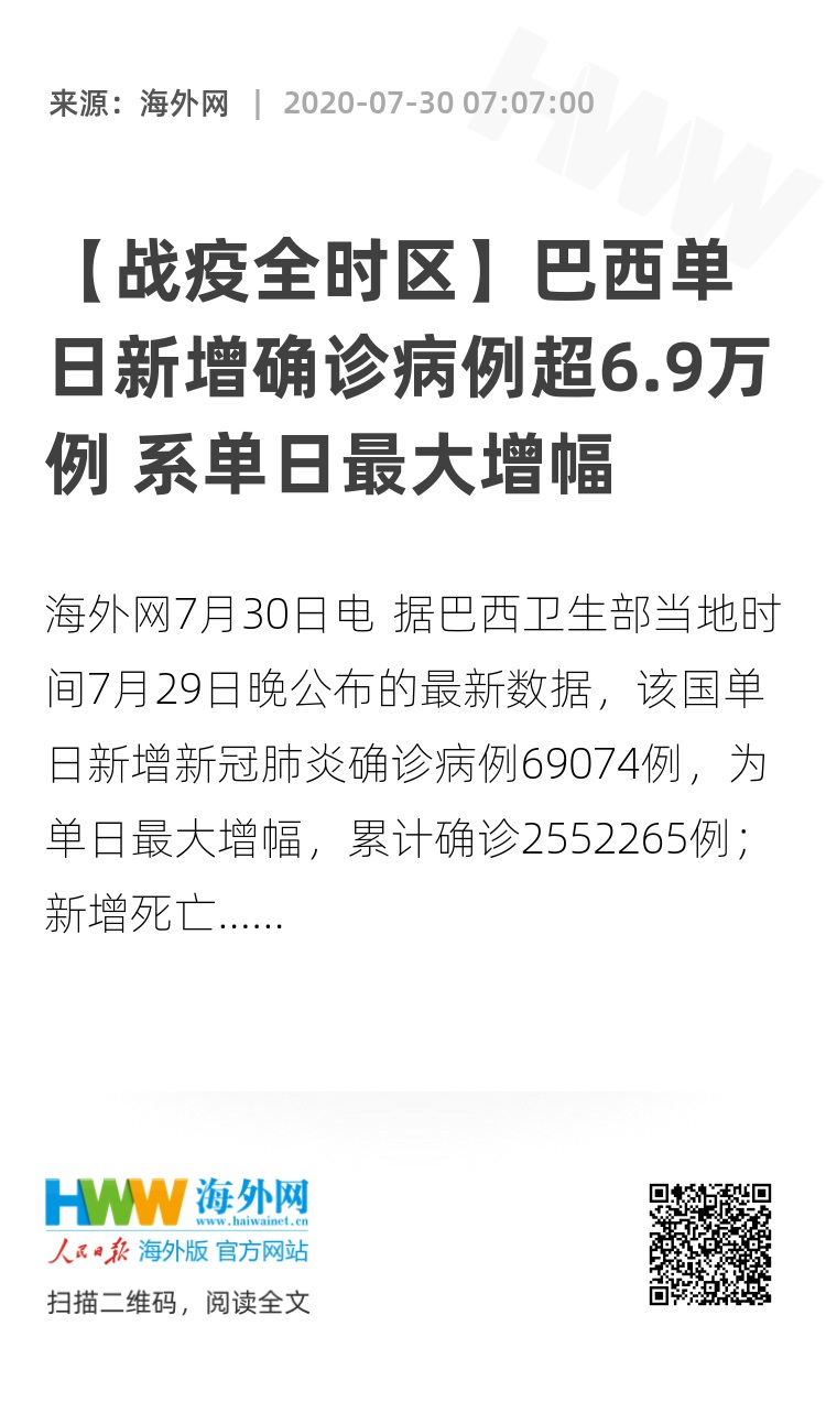 海外网7月30日电 据巴西卫生部当地时间7月29日晚公布的最新数据,该国单日新增新冠肺炎确诊病例69074例,为单日最大增幅,累计确诊2552265例;新增死亡病例1595例,累计死亡病例90134例。目前,巴西确诊病例和死亡病例仍居全球第二,仅次于美国。