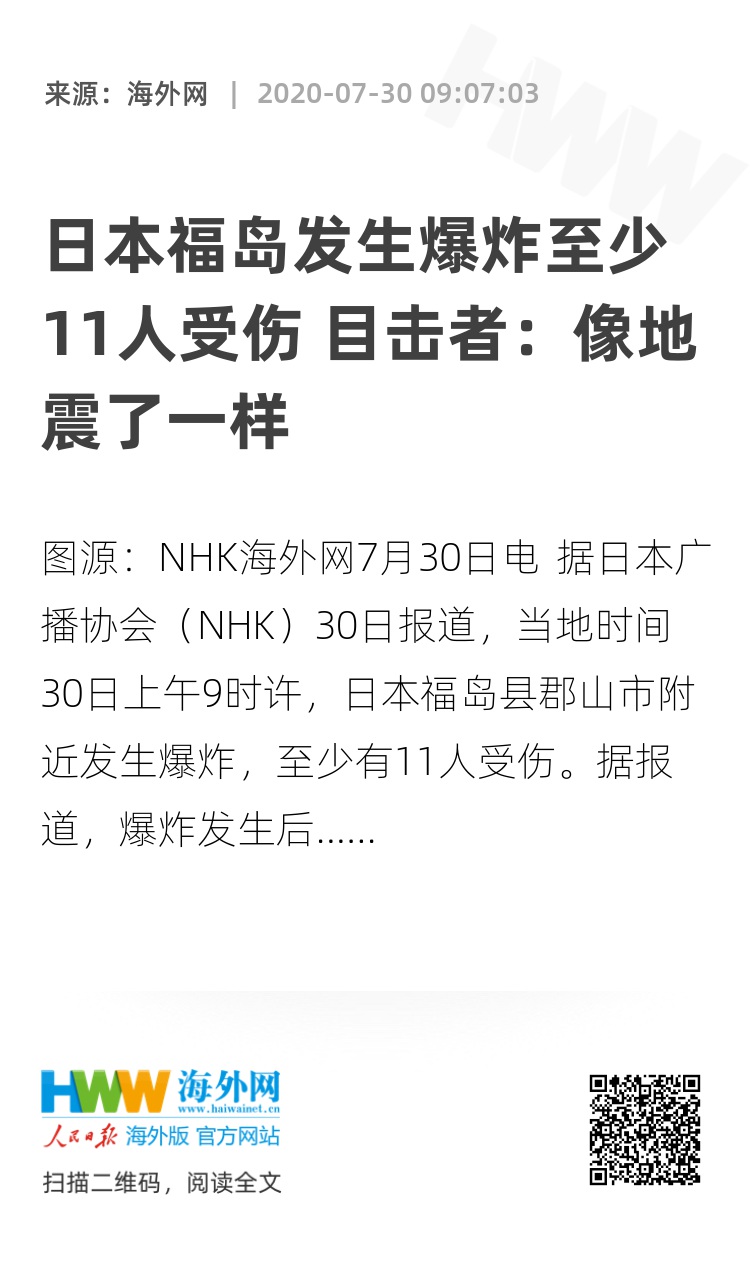 海外网7月30日电 据日本广播协会(NHK)30日报道,当地时间30日上午9时许,日本福岛县郡山市附近发生爆炸,至少有11人受伤。